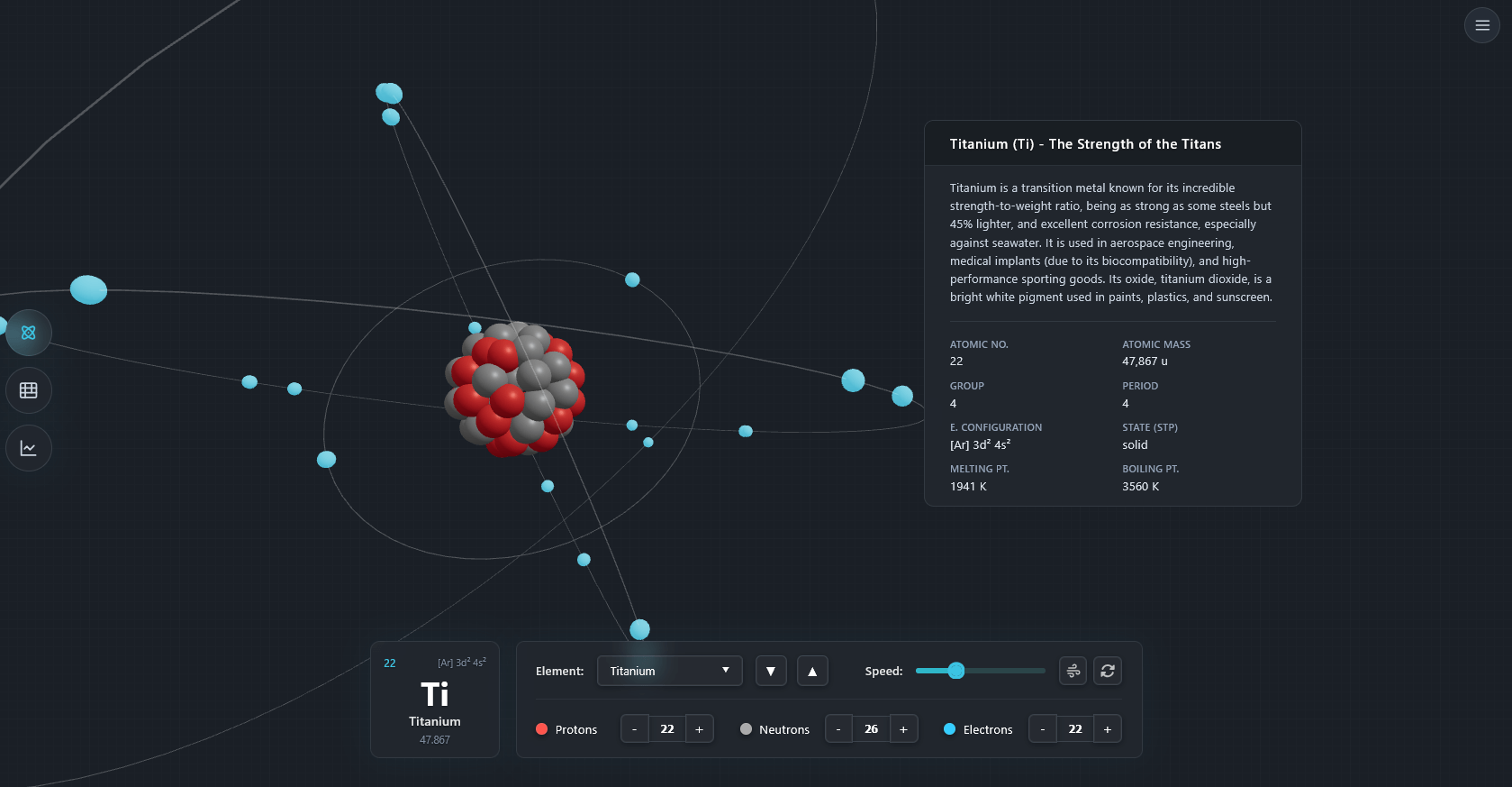 Explora la estructura atómica con animaciones 3D interactivas, la tabla periódica y visualizaciones de datos químicos.