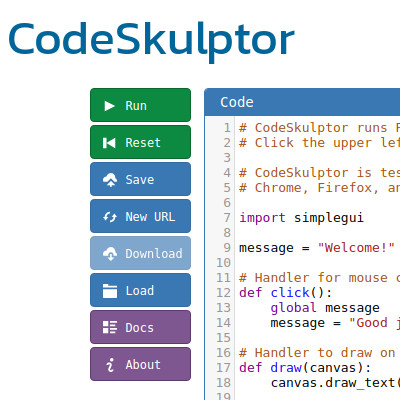 Codeskulptor es un intérprete Python que se ejecuta en una ventana de navegador web, sin tener que instalar en el ordenador. Los usuarios pueden entonces visitar el sitio de codeskulptor.org para crear, ejecutar, guardar y exportar sus programas mediante el uso de un navegador e Internet.