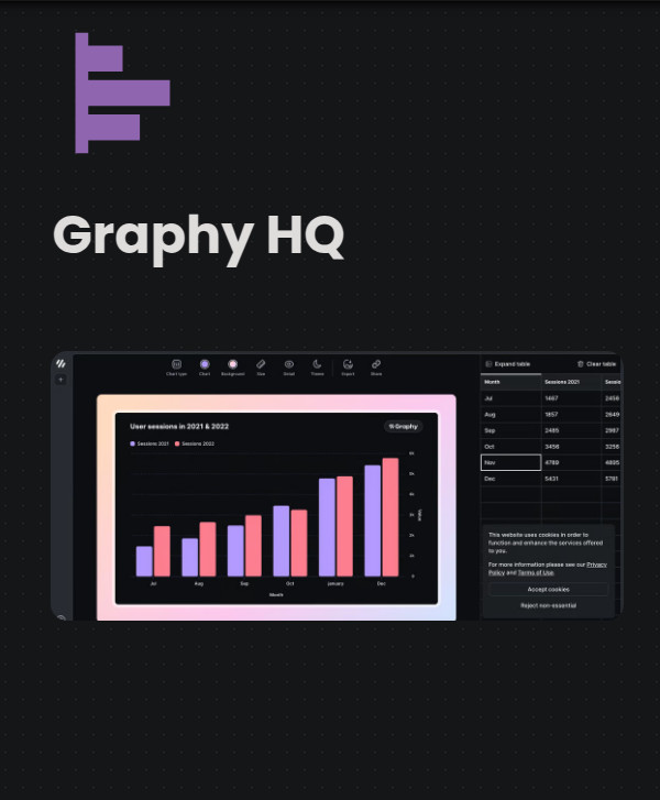 Graphy HQ es una plataforma increíble que facilita el análisis de datos y la elaboración de tablas y gráficos enriquecidos con información generada por la Inteligencia Artificial. Sólo necesitas ingresar datos básicos y la herramienta te proporcionará un análisis conciso, ofreciéndote la oportunidad de personalizar la información y crear atractivas e innovadoras representaciones visuales sin esfuerzo.