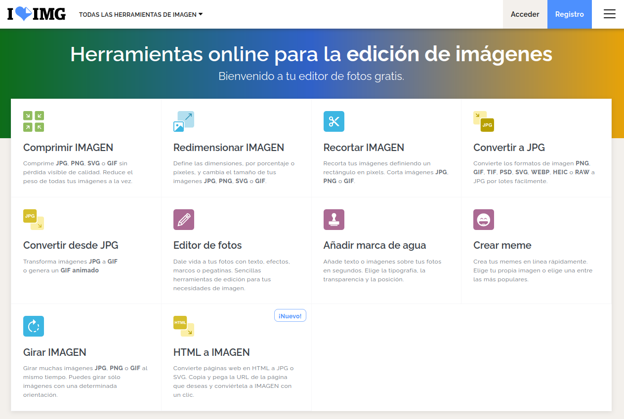 Es el software dirigido a todos aquellos que desean editar imágenes en línea de una manera rápida y sencilla. Con este programa tendrás a tu disposición herramientas básicas para la edición de imágenes en línea totalmente gratis. iLoveIMG permite comprimir, cambiar el tamaño de las imágenes, recortar, convertir a otros formatos, etc.