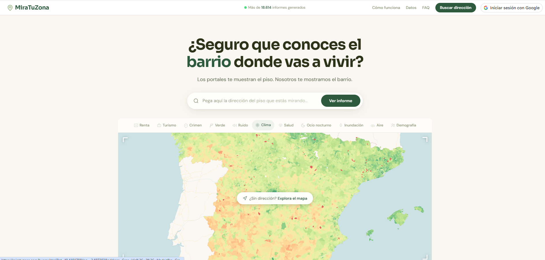 MiraTuZona es una plataforma web informativa que permite consultar y comparar barrios y zonas de España antes de comprar o alquilar una vivienda. La página reúne datos de fuentes oficiales públicas (como estadísticas y registros gubernamentales) y los muestra de forma sencilla para que los usuarios puedan analizar características de cada zona.