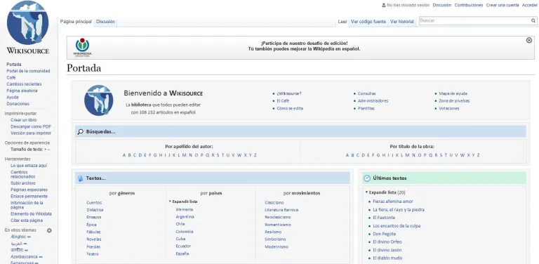 Wikisource es un proyecto paralelo de Wikipedia, cuyo objetivo es formar una biblioteca de textos originales libres de derechos, que hayan sido publicados con licencia GFDL, Creative Commons o que sean de Dominio Público; junto con su traducción en distintas lenguas.